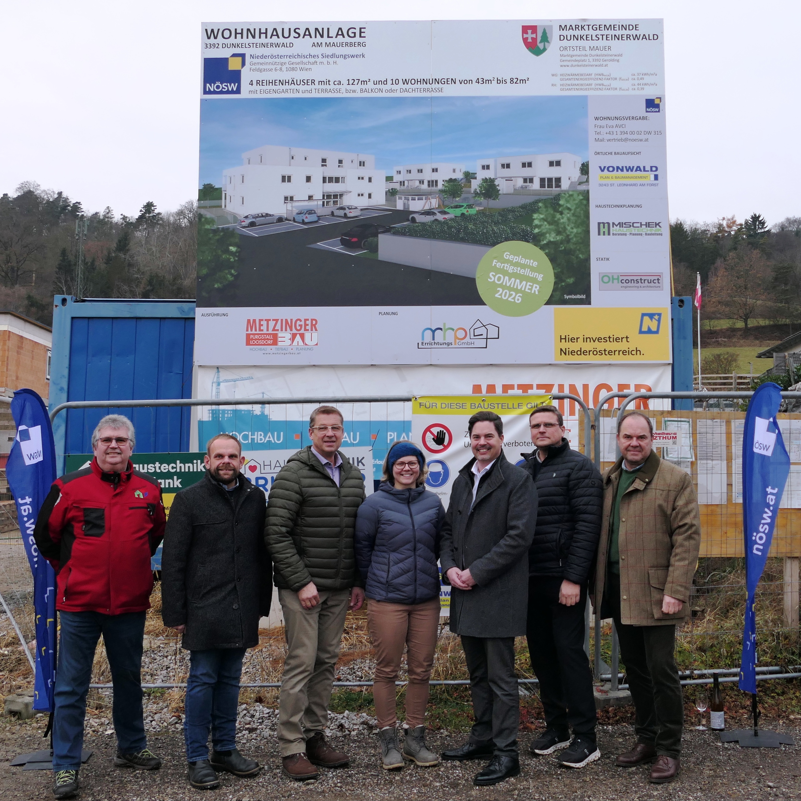 Das Niederösterreichische Siedlungswerk (NÖSW) feierte am 26. November 2025 in Mauer bei Melk die Dachgleiche seiner neuen Wohnanlage. Schritt für Schritt entstehen an der Adresse Obere Maurerberggasse/Am Maurerberg vier Doppelhaushälften und zehn geförderte Mietwohnungen. Das NÖSW reagiert mit diesem Projekt auf die steigende Nachfrage nach leistbarem Wohnraum in der Region.