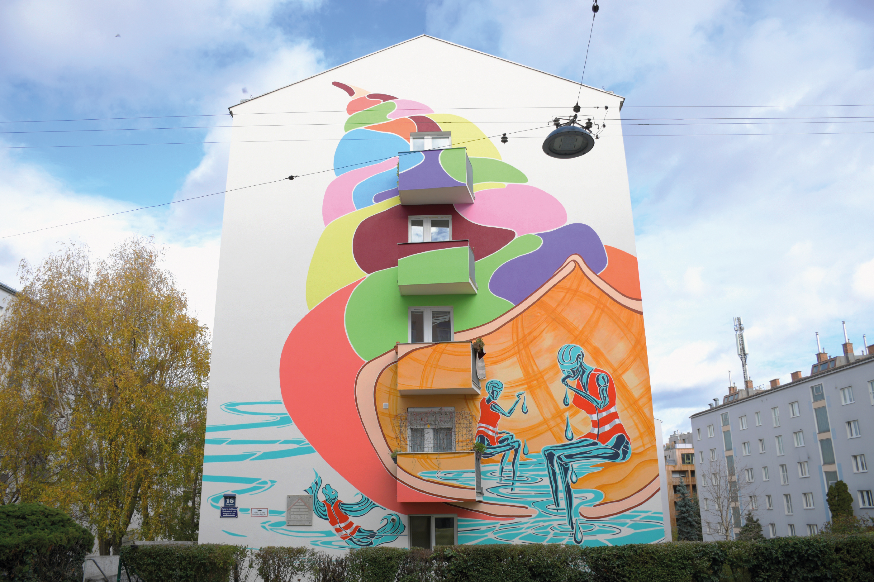 Der Umsetzungsprozess wurde kuratorisch von KÖR Wien betreut und erfolgte produktionstechnisch in Abstimmung und mit Unterstützung des ÖSW. Die Firma Sto Ges.m.b.H. unterstützte das Projekt tatkräftig mit Expertise und hochwertigem Farbmaterial. „Mit der Fassadenkunst möchten wir den Dialog zwischen den Bewohner:innen anregen, auf gesellschaftlich relevante Themen aufmerksam machen und die Identifikation mit dem Gebäude und der Nachbarschaft stärken“, betont Markus Fichta, stellvertretender Generaldirektor des ÖSW und unterstreicht die gesellschaftliche Bedeutung des Projekts: „Es reflektiert aktuelle Themen wie Critical Care und das komplexe Zusammenspiel zwischen Individuum, Gemeinschaft und Planet. Es steht für unsere Verbundenheit mit der Mieterschaft und die Wertschätzung der kulturellen Vielfalt und Kreativität in unserer Stadt.“